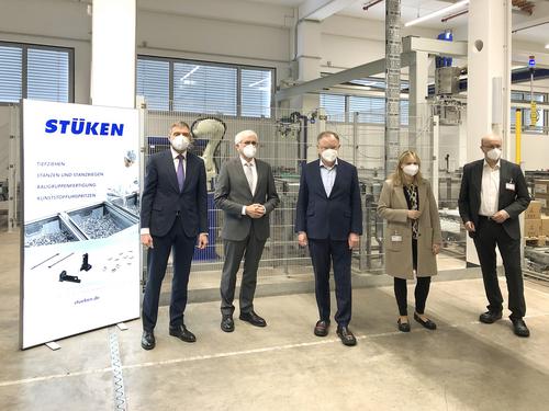 Rinteln, April 14th, 2021 - As a partner for new developments in e-mobility and as a driver of digitalization with its Production System 4.0, deep drawing specialist STÜKEN has its finger on the pulse. Lower Saxony's Minister President Stephan Weil wanted to get an idea of this on site. During a tour of the production facilities at the headquarters of the globally positioned company, he learned about the innovative products STÜKEN is currently working on and the challenges that must be overcome together.